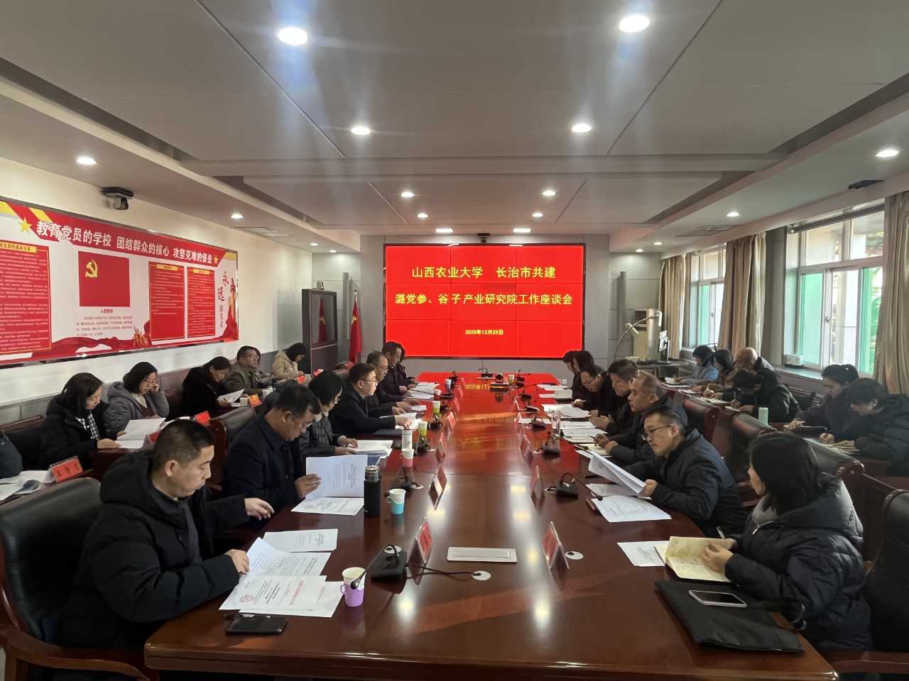 2025年12月25日,长治市与山西农业大学共建潞党参、谷子产业研究院工作座谈会在长治市农业农村局顺利召开。山西农业大学党委常委、副校(院)长李捷,社会服务部部长邢宝龙,社会服务部副部长任永玲,山西农业大学生命科学学院院长牛颜冰,山西农业大学谷子研究所所长王军及相关专家教授,长治市中药材产业发展中心主任郭岢峰及市农业农村局相关科室负责人共计30人参加会议。会议由山西农业大学社会服务部部长邢宝龙主持。