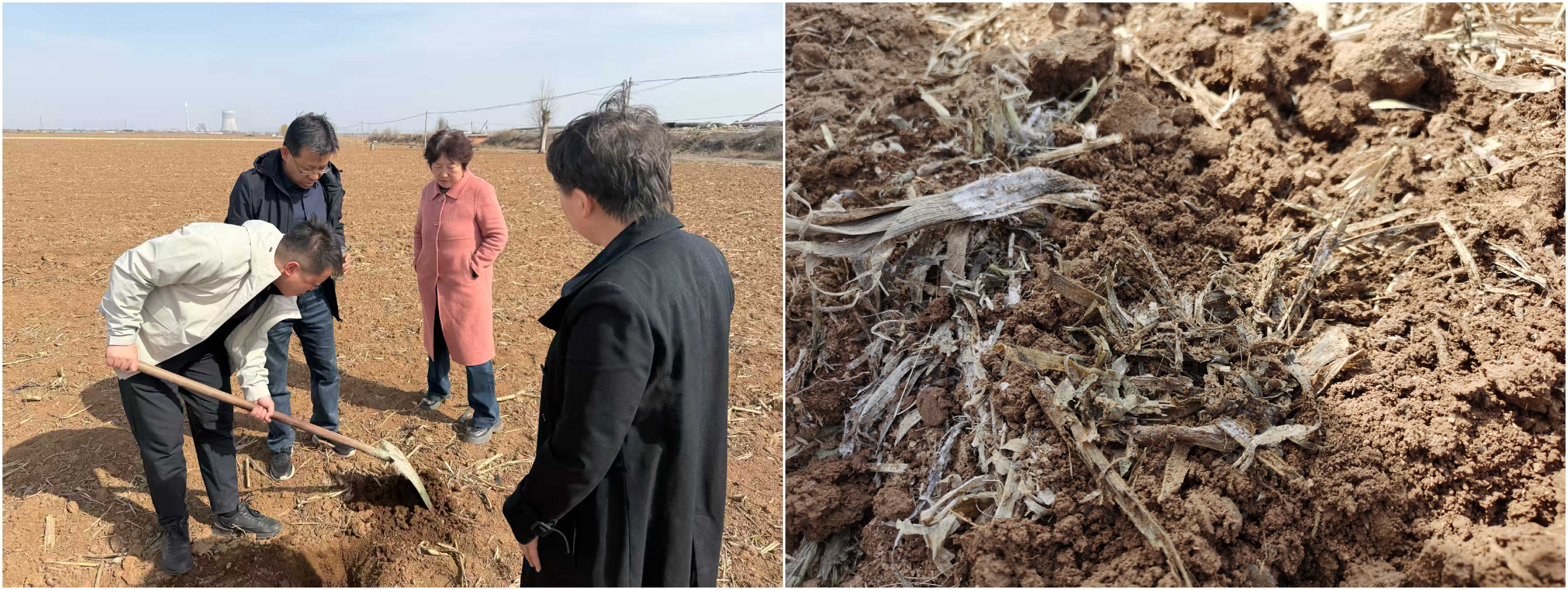 技术服务组在丹朱镇中郜村察看玉米秸秆腐熟剂应用试验情况,通过设置不同腐熟剂用量梯度,研究其对秸秆腐熟进程、土壤理化性质及后茬作物生长的影响,为指导秸秆还田生产和耕地质量提升提供科学依据。在鲍店镇王家庄村、石哲镇西汉村、南陈镇西尧村等实地察看秸秆收储设施建设和设备购置情况,与主体负责人就秸秆还田、收储、加工、处理、饲料化利用等方面现场交流,并提出工作建议。在丹朱镇下霍村察看废旧地膜回收处置台账,与企业负责人详细了解地膜科学使用、废旧地膜回收网络体系建设等情况。